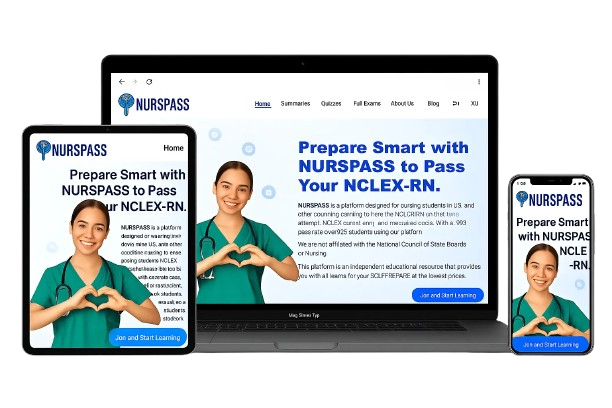 NURSPASS is a platform designed for nursing students in the U.S. and other countries seeking to pass the NCLEX-RN on their first attempt. Access summarized content, NCLEX-style exams, and interactive tools. With a 98% pass rate,over 25 855 students have trusted our platform.